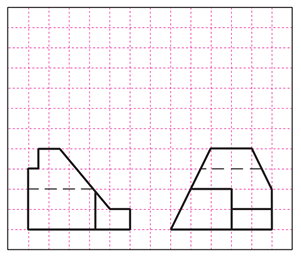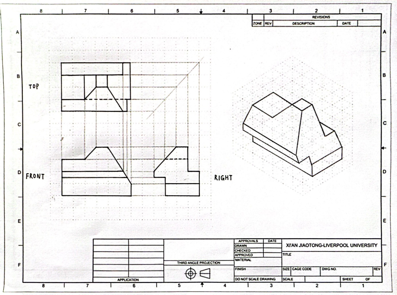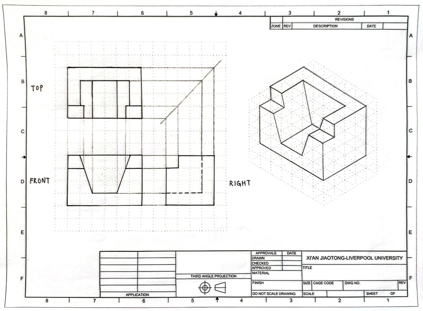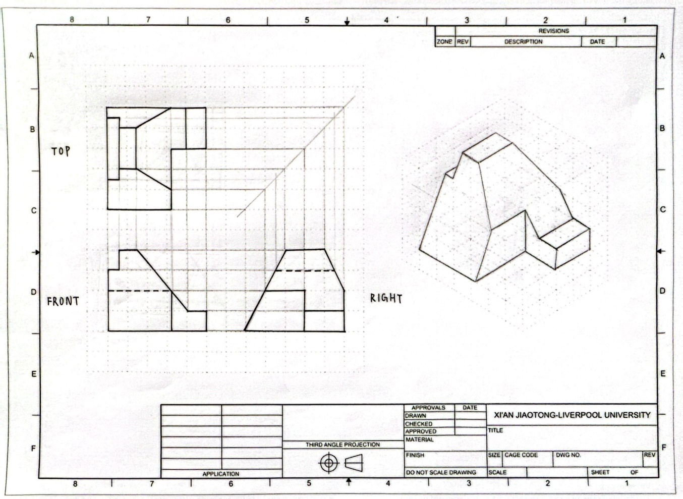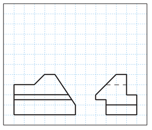 The front view and right-side view were first interpreted to reconstruct the geometry of the object. Based on this, the missing top view and the isometric sketch were produced.